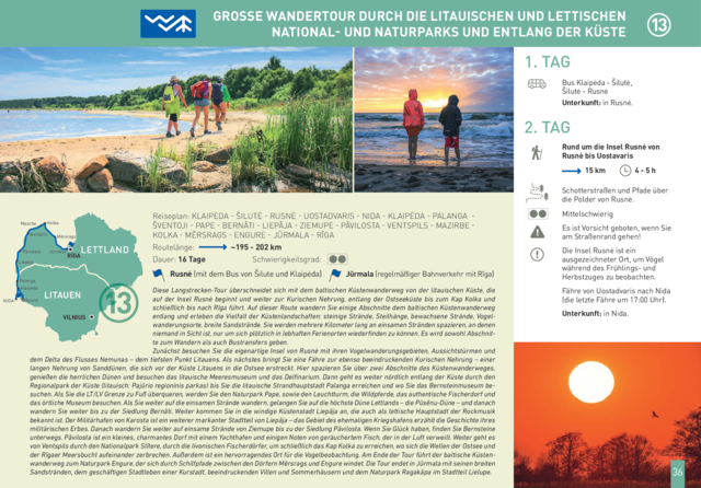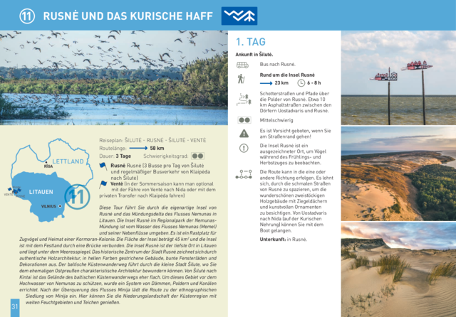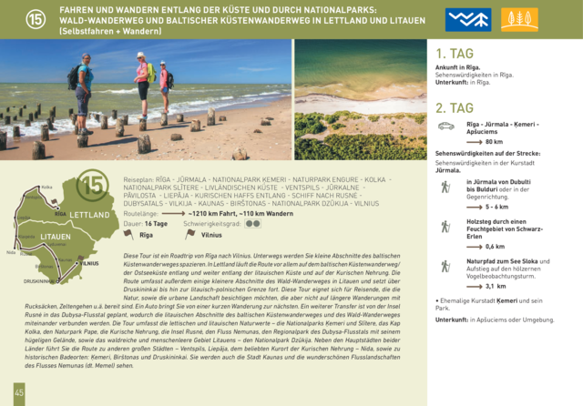 Rīga - Jūrmala - Nationalpark Ķemeri - Naturpark Engure - Kolka - Nationalpark Slītere - Livländischen Küste - Ventspils - Jūrkalne - Pāvilosta - Liepāja - Kurischen Haffs Entlang - Schiff Nach Rusnė - Dubysatals - Vilkija - Kaunas - Birštonas - Nationalpark Dzūkija - Vilnius Dauer: 16 Tage Routelänge: ~1210 km Fahrt, ~110 km Wandern |