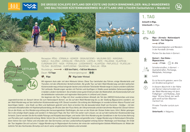Die Broschüre umfasst 15 eintägige und mehrtägige (bis zu 16 Tage) Wandertouren in Lettland und Estland, die Teil des Fernwanderweges Baltischer Küstenwanderweg sind (in Lettland - Jūrtaka, in Estland - Ranniku Matkarada genannt) (E9). Das sind die interessantesten und landschaftlich schönsten Küstengebiete beider Länder, die für ihre Natur- und Kulturobjekte bekannt sind. Mehrere Touren führen durch Nationalparks, Naturparks und Biosphärenreservate, als auch durch Orte, die zum UNESCO Weltkulturerbe gehören.