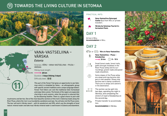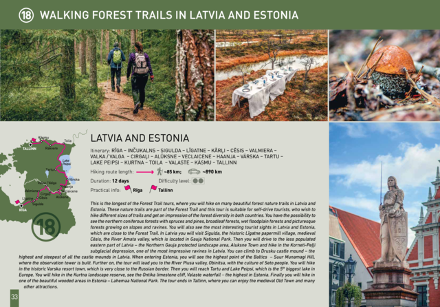 Walking forest nature trails in Latvia and Estonia Rīga – Inčukalns – Sigulda – Līgatne – Kārļi – Cēsis – Valmiera – Valka / Valga – Cirgaļi – Alūksne – Veclaicene – Haanja – Värska – Tartu – Lake Peipsi – Kurtna – Toila – Valaste – Käsmu – Tallinn Duration: 12 days Distance: ~85 km; driving: ~890 km |