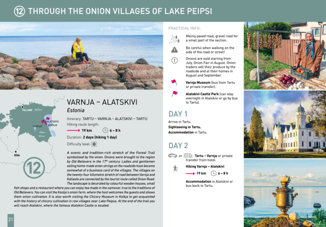 A scenic and tradition-rich stretch of the Forest Trail symbolised by the onion. Onions were brought to the region by Old Believers in the 17th century. Ladies and gentlemen selling home-made onion strings on the roadside have become somewhat of a business card of the villages. The villages on the twenty-four kilometre stretch of road between Varnja and Kallaste are connected by the tourist route called Onion Road. The landscape is decorated by colourful wooden houses, small fish shops and a restaurant where you can enjoy tea made in the samovar, true to the traditions of Old Believers. You can visit the Kostja’s onion farm, where the host welcomes the guests and shows them onion cultivation. It is also worth visiting the Chicory Museum in Kolkja to get acquainted with the history of chicory cultivation in row villages near Lake Peipus. At the end of the trail you will reach Alatskivi, where the famous Alatskivi Castle is located. |