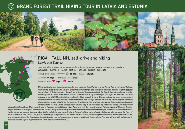 Grand Forest Trail hiking tour in Latvia and Estonia: Riga – Tallinn, self-drive and hiking (LV/EE) Rīga – Sigulda – Līgatne – Āraiši – Cēsis – Valmiera – Tartu – Kuremäe – Vasavere – Rakvere – Altja – Oandu – Käsmu – Kolga – Tallinn Duration: 10 days Distance: ~68 km; driving: ~630 km |