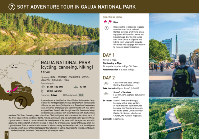 Soft adventure tour in Gauja National Park (LV) (cycling, canoeing, hiking) Riga – Strenči – Valmiera – Cēsis – Līgatne – Sigulda – Riga Duration: 2 days Distance: cycling 84 km (113 km), canoeing 17 km, hiking 30 km (40 km) |