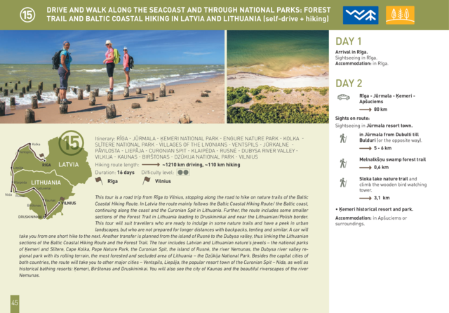 Rīga - Jūrmala - Ķemeri National Park - Engure Nature Park - Kolka - Slītere National Park - Villages Of The Livonians - Ventspils - Jūrkalne - Pāvilosta - Liepāja - Curonian Spit - Klaipėda - Rusnė - Dubysa River Valley - Vilkija - Kaunas - Birštonas - Dzūkija National Park - Vilnius Duration: 16 days Distance: 1210 km driving, 110 km hiking |