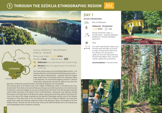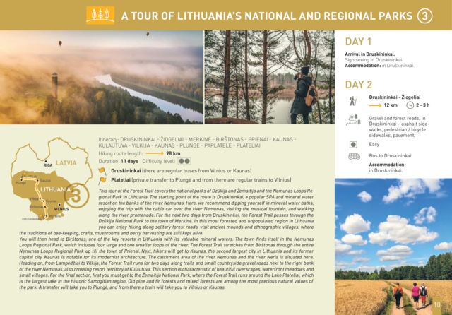 This tour of the Forest Trail covers the national parks of Dzūkija and Žemaitija and the Nemunas Loops Regional Park in Lithuania. The starting point of the route is Druskininkai, a popular SPA and mineral water resort on the banks of the river Nemunas. Here, we recommend dipping yourself in mineral water baths, enjoying the trip with the cable car over the river Nemunas, visiting the musical fountain, and walking along the river promenade. For the next two days from Druskininkai, the Forest Trail passes through the Dzūkija National Park to the town of Merkinė. In this most forested and unpopulated region in Lithuania you can enjoy hiking along solitary forest roads, visit ancient mounds and ethnographic villages, where the traditions of bee-keeping, crafts, mushrooms and berry harvesting are still kept alive. You will then head to Birštonas, one of the key resorts in Lithuania with its valuable mineral waters. The town finds itself in the Nemunas Loops Regional Park, which includes four large and one smaller loops of the river. The Forest Trail stretches from Birštonas through the entire Nemunas Loops Regional Park up till the town of Prienai. Next, hikers will get to Kaunas, the second largest city in Lithuania and its former capital city. Kaunas is notable for its modernist architecture. The catchment area of the river Nemunas and the river Neris is situated here. |