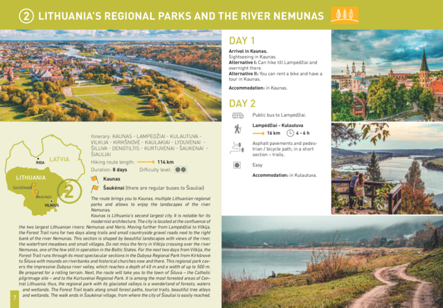 Lithuania’s regional parks and the river Nemunas Kaunas - Lampėdžiai - Kulautuva - Vilkija - Kirkšnovė - Kaulakiai - Lyduvėnai - Šiluva - Dengtiltis - Kurtuvėnai - Šaukėnai - Šiauliai Duration: 8 days Distance: 114 km |
