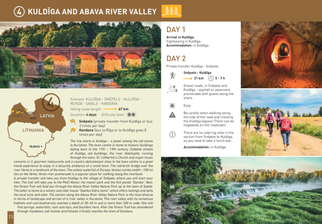 The trip starts in Kuldīga – a jewel among the old towns in Kurzeme. The town centre is home to historic buildings A private transfer will take you from Kuldīga to the village of Snēpele, where you will start your hike. The trail will take you to the Pelči Manor, the manor park and the fish ponds “Damba”. Next, the Forest Trail will lead you through the Abava River Valley Nature Park up to the town of Sabile. The latter is home to a winery and cider house “Sabiles Sidra nams”, which offers tastings and sells the local wine and cider. The section along the Abava River Valley Nature Park is the most diverse in terms of landscape and terrain of a river valley in Kurzeme. The river valley with its numerous habitats and vast biodiversity reaches a depth of 30–40 m and is more than 300 m wide. One will find springs, waterfalls, rock outcrops, and boulders here. After the Forest Trail has meandered through meadows, oak forests and hillocks it finally reaches the town of Kandava. |