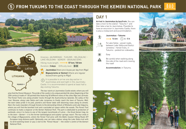 The tour starts at Jaunmokas Castle estate, where you will also find the Forest Museum. The pride of the castle is its unique painted tile stove (beginning of the 20th century) made of 130 painted tiles featuring 50 different views of the cities Rīga and Jūrmala. The Forest Trails runs along smaller tracks through the Austrumkursa Uplands, the valley of the river Slocene, along Lake Sekļa and Lake Jumprava to finally reach the town of Tukums. Well, the town takes pride in its pots, planters and flower beds with blooming roses along its streets. Next, the route meanders through forests to the demanding hillock of Milzkalns and Lake Valguma, where you will find the barefoot trail and a secluded art space within the woods. The Forest Trail continues to make a stopover at the Ķemeri National Park. The park is dedicated to protection of wetlands, since it is home to one of the largest marshlands of Latvia – the Great Ķemeri bog. As to the town – Ķemeri – it is the former balneological and sulphur springs resort. The tour ends in the village of Bigauņciems, where the Forest Trail joins with the Baltic Coastal Hiking Route (E9 European long distance path). Optionally, one can take a detour along the Lake Sloka trail with its bird-watching tower or pay a visit to the “Forest House” – the visitor’s centre of the Ķemeri National Park. | ![]() |
