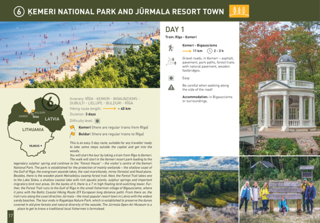 This is an easy 3-day route, suitable for any traveller ready to take some steps outside the capital and get into the You will start the tour by taking a train from Rīga to Ķemeri. The walk will start in the Ķemeri resort park leading to the legendary sulphur spring and continue to the “Forest House” – the visitor’s centre of the Ķemeri National Park. The park is established for the protection of mainly wetlands – the shallow coast of the Gulf of Riga, the overgrown seaside lakes, the vast marshlands, mires (forests) and flood plans. Besides, there is the wooden plank Melnalkšņu swamp forest trail. Next, the Forest Trail takes one to the Lake Sloka, a shallow coastal lake with rich aquatic plants, sulphur springs and important migratory bird rest areas. On the banks of it, there is a 7 m high floating bird-watching tower. Fur- ther, the Forest Trail runs to the Gulf of Riga in the small fishermen village of Bigauņciems, where it joins with the Baltic Coastal Hiking Route (E9 European long distance path). From there on, the trail runs along the coast direction Jūrmala – the most popular resort town in Latvia with the widest sandy beaches. The tour ends in Ragakāpa Nature Park, which is established to preserve the dunes covered in old pine forests and natural diversity of the seaside. The Jūrmala Open-Air Museum is a place to get to know a traditional local fishermen’s farmstead. |