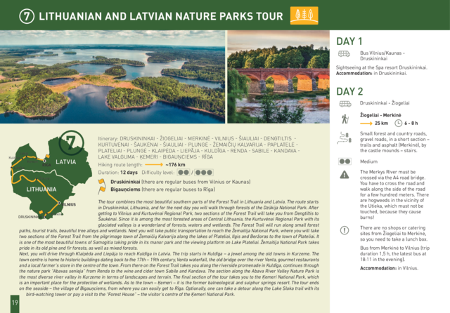The tour combines the most beautiful southern parts of the Forest Trail in Lithuania and Latvia. The route starts in Druskininkai, Lithuania, and for the next day you will walk through forests of the Dzūkija National Park. After getting to Vilnius and Kurtuvėnai Regional Park, two sections of the Forest Trail will take you from Dengtiltis to Šaukėnai. Since it is among the most forested areas of Central Lithuania, the Kurtuvėnai Regional Park with its glaciated valleys is a wonderland of forests, waters and wetlands. The Forest Trail will run along small forest paths, tourist trails, beautiful tree alleys and wetlands. Next you will take public transportation to reach the Žemaitija National Park, where you will take two sections of the Forest Trail from the pilgrimage town of Žemaičių Kalvarija along the lakes of Plateliai, Ilgis and Beržoras to the town of Plateliai. It is one of the most beautiful towns of Samogitia taking pride in its manor park and the viewing platform on Lake Plateliai. Žemaitija National Park takes pride in its old pine and fir forests, as well as mixed forests. Next, you will drive through Klaipėda and Liepāja to reach Kuldīga in Latvia. The trip starts in Kuldīga – a jewel among the old towns in Kurzeme. The town centre is home to historic buildings dating back to the 17th – 19th century, Venta waterfall, the old bridge over the river Venta, gourmet restaurants and a local farmer’s store in the centre of the town. From there on the Forest Trail takes you along the riverside promenade in Kuldīga, continues through the nature park “Abavas senleja” from Renda to the wine and cider town Sabile and Kandava. The section along the Abava River Valley Nature Park is the most diverse river valley in Kurzeme in terms of landscapes and terrain. The final section of the tour takes you to the Ķemeri National Park, which is an important place for the protection of wetlands. As to the town – Ķemeri – it is the former balneological and sulphur springs resort. The tour ends on the seaside – the village of Bigauņciems, from where you can easily get to Rīga. Optionally, one can take a detour along the Lake Sloka trail with its bird-watching tower or pay a visit to the “Forest House” – the visitor’s centre of the Ķemeri National Park. |