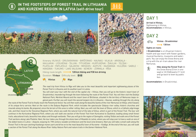 In the footsteps of Forest Trail in Lithuania and Kurzeme Region in Latvia (self-drive tour) Vilnius - Druskininkai - Birštonas - Kaunas - Vilkija - Ariogala - Kaulakiai - Lyduvėnai - Šiluva - Tytuvėnai - Kurtuvėnai - Šiauliai - Telšiai - Plateliai - Paplatelė - Salantai - Mosėdis - Aizpute - Kazdanga - Kuldīga - Sabile - Kandava - Tukums – Lake Valguma - Ķemeri - Jūrmala - Rīga Duration: 15 days Distance: 128 km hiking, 930 km driving |